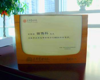 2008年12月,我公司总经理田传科收到北京大学光华管理学院颁发的 “北京大学光华管理学院MBA特聘导师”的证书,正式受聘于北京大学光华管理学院。北京大学是享誉世界的百年名校,光华管理学院是中国最好的商学院之一,是中国经济建设理论和实践的前沿阵地,培养了大批的商界精英,此次我公司总经理受聘于北京大学光华管理学院,不仅是田总的学术造诣和实际管理经验上都达到了相当高的水平的象征,也说明我们所处的行业正在日益受到学术界的关注,相信我们公司发展历程作为成功案例进入教学将指日可待。