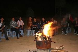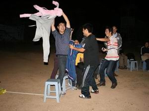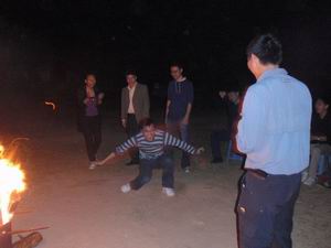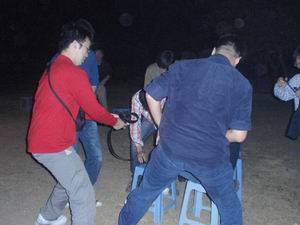 在野外的空地上,围着温暖的火堆,抬头仰望星空,感受着完全不同于城市的气息。待大家围绕篝火坐下来后,接下来的游戏就要考验大伙的反应能力。按照“我想到了什么我就想到了什么”的句式,进行接龙,要求这两个必须是实物、有联系而且不能重复,每个人最多3秒钟的反应时间,稍微停顿一下,就被抓出去准备表演节目了。大家玩的不亦乐乎,但最终还是有人不幸落网,被迫表演了节目。