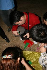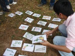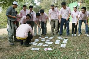 黄锋队,一队12人,每4人一组,由蓝线内的队员摆放好10张一堆的卡片,每组记录一堆,每人记录2-3张,这样的分配是完全信任队友的配置,每个人都看的是自己的卡片,团队只能无限信任你独自考虑出的答案,若在个别数字方面有冲突,下轮团队对有冲突的卡片进行核实。其他队员带了一个照相机,准备“投机取巧”的把散落在蓝线内的卡片全部拍下,以便让队员记忆和认知,算是个情报员的工作吧。第一次行动开始了,在紧张的60秒内,黄锋队把信息全部收集,在相机的帮助下,团队可对了一大部分的卡片,就等下次的冲刺了。