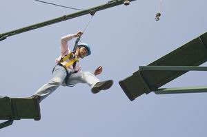 在太湖边上高高架起了两块摇摇欲坠的相隔1.7米左右的木板,暂且称之为桥吧。参与者要徒手爬上离地面有8米高的“桥”,在空中做飞跃动作。虽然全副武装,也戴上了安全帽,也有牢固到可以承受2吨重量的绳索保护,但在高空中,脚踏三十公分的“桥”,还要做飞跃,确实是个不小的挑战。
