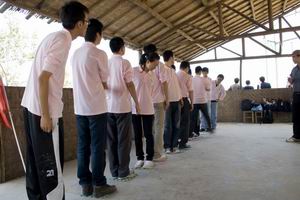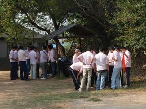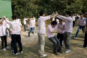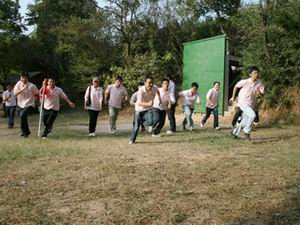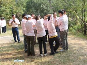 为了使拓展更有竞争性,教练让大家按照1、2进行报数、分组,然后就开始准备各队的队名、队旗、口号和队歌等工作。10分钟后,经过激烈的讨论,野狼队和黄锋队均成型,队长、队秘、菲佣,分工明确、各司其职。