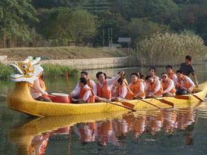 在活动最后,两队赛起了“龙舟”,每队将随机分得一个可容纳十名船手,一名鼓手的大龙舟。游戏的初衷本来是:在哨声响起后,队员们齐心协力划动龙舟向前进,绕过指定水上标志物后,返回港口。在整个过程中,耗时最少的队伍取得胜利。在赛龙舟的过程中锻炼队员之间的统一性和灵活配合性,建立良好的团队氛围。但是,到了最后,竟然变成了“打水仗”、“抢队旗”。嬉闹了一阵,两队各自划着船,泛舟太湖,享受这难得的时光。“野狼队”更是童心未泯,在队长的带领下,唱起了《让我们荡起双桨》,歌声渺渺……