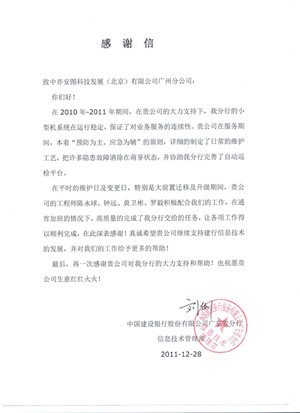 驻广东建行运维团队协助客户完善自动巡检平台,保障系统稳定安全的运行,高效高质的完成了每一次任务,得到了客户的好评。并且“预防为主,应急为辅”的服务原则也得到了客户高度认可。广东建行特发来表扬信,表彰