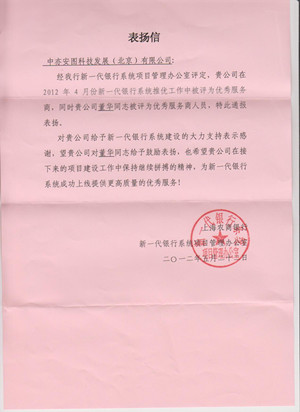 2012年6月6日,上海农村商业银行发来表扬信,表彰