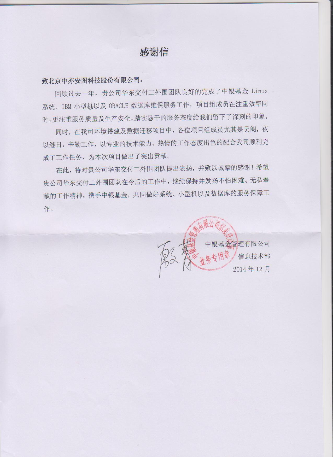 近日,公司收到了中银基金客户发来的感谢信,表彰公司服务交付团队一年来对其IT基础架构运维服务的大力支持。客户指出,项目工程师技术过硬、踏实肯干、注重效率和质量,让客户从日常的工作中体会到了