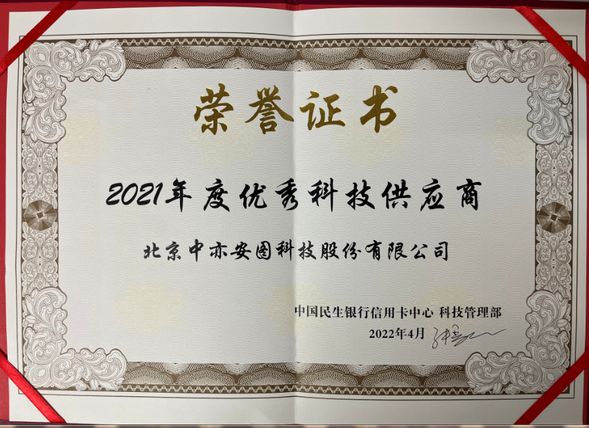 近日,在“民生银行信用卡中心第二届十佳科技供应商”表彰大会上,北京中亦安图科技股份有限公司(以下简称:中亦科技)再次获评运维条线“2021年度优秀科技供应商”荣誉称号,这也代表着客户对中亦科技运维托底能力的充分肯定。