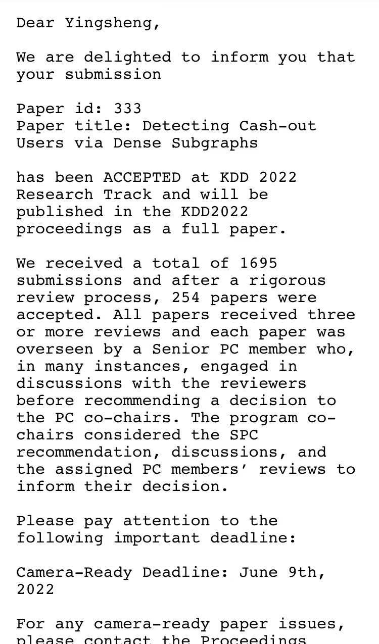 近日,由北京中亦安图科技股份有限公司(以下简称:中亦科技)大数据产品团队撰写的论文《Detecting Cash-out Users via Dense Subgraphs》被ACM SIGKDD 2022(国际数据挖掘与知识发现大会,KDD)正式收录。论文使用了密集子图技术,应用于金融科技反欺诈场景,是图谱技术在金融科技领域应用的真正落地和突破,本次论文收录也代表着中亦科技在相关领域的创新研究得到了业内顶尖会议的肯定和认可。