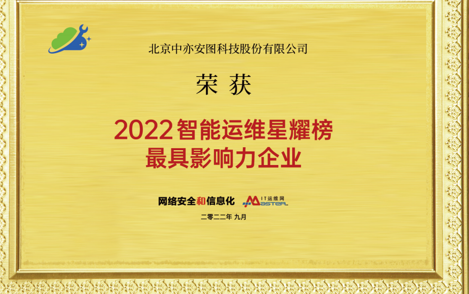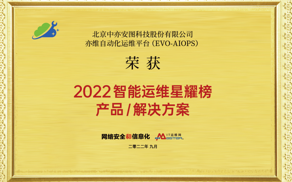 IT运维大会依据技术创新能力、市场领导力、用户满意度、发展潜力四大维度评价体系,评出2022智慧运维星耀榜。北京中亦安图科技股份有限公司(以下简称:中亦科技,股票代码:301208,SZ)凭借对智能运维的深刻洞察与丰富的运维经验,荣获2022智能运维星耀榜最具影响力企业,亦维自动化运维平台(EVO-AIOPS)荣获2022智能运维星耀榜产品/解决方案奖项。