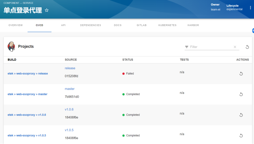 通过 CI/CD 界面,可以看到 Jenkins 构建的结果,如果有异常,可以尝试直接点击重新构建: