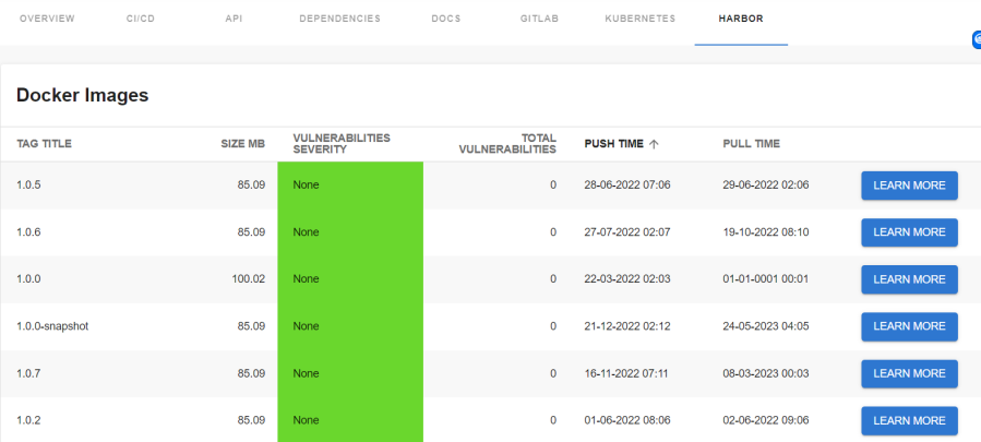 通过 Harbor 界面,可以看可用的镜像信息,以及安全扫描的结果: