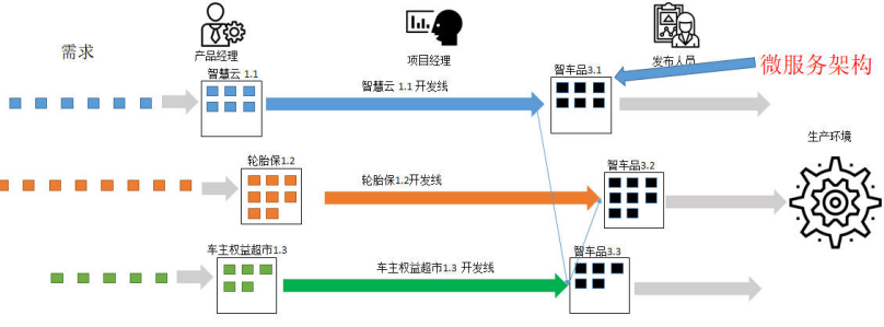 可以看到团队会根据不同的需求来源创建项目,然后每个项目按照自己的节奏发布。每次上线,都需要反复经历合并代码、回归测试和应用部署等工作。
