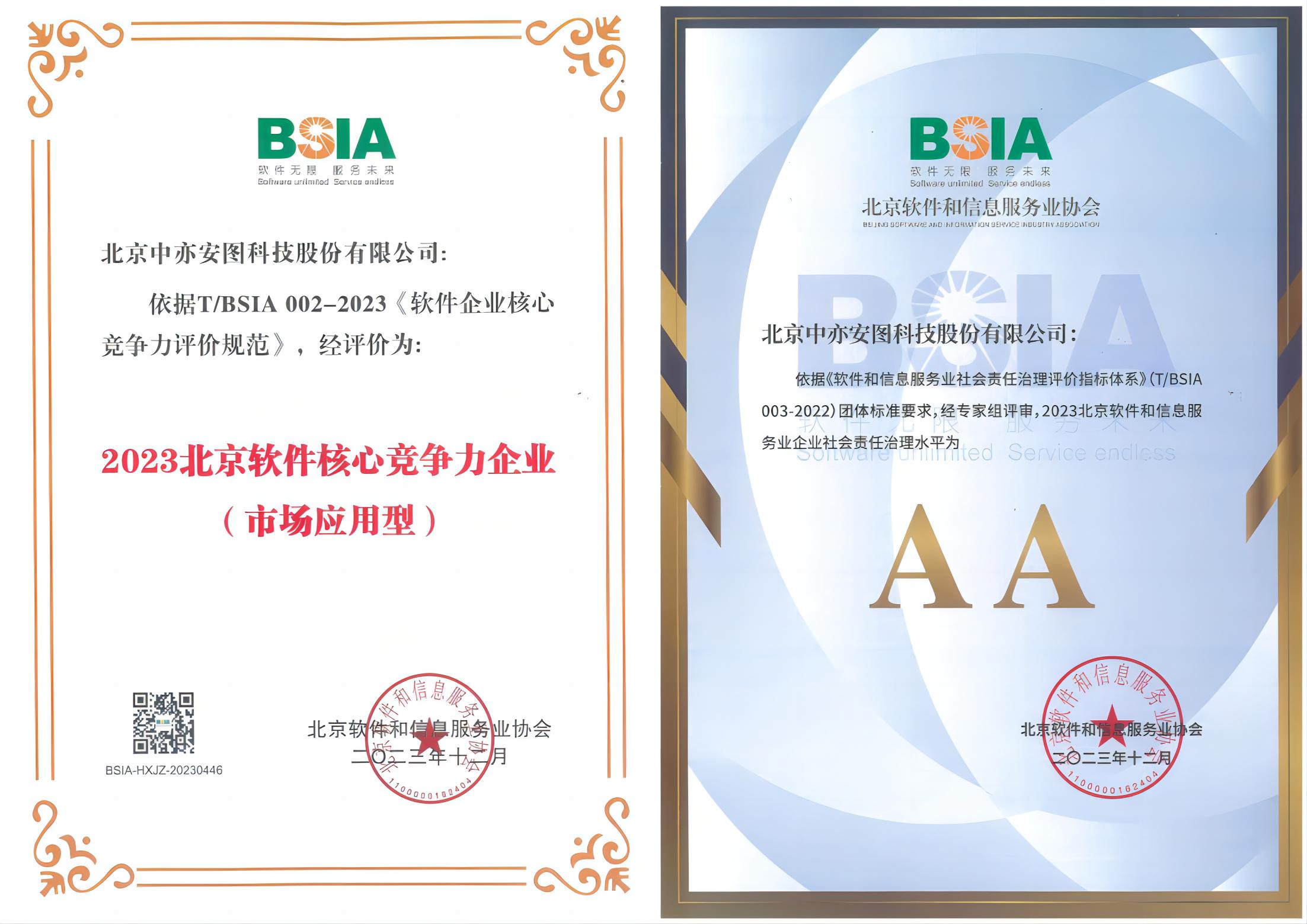 近日,北京软件和信息服务业协会公布了2023年度软件企业竞争力榜单,中亦科技凭借卓越的市场表现和技术创新能力,荣获“2023北京软件核心竞争力企业(市场应用型)”称号。同时,中亦科技还获得了“2023北京软件和信息服务业企业社会责任治理水平AA级”认证,充分体现了公司在履行社会责任方面的优异表现。