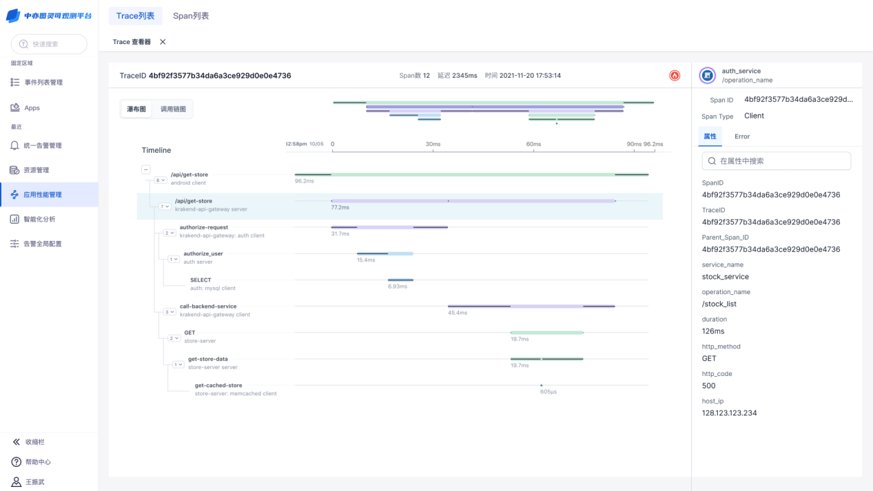 平台支持以瀑布图方式查看span分布情况,使用户更加直观清晰的查看span详情,实现链路的可观测。