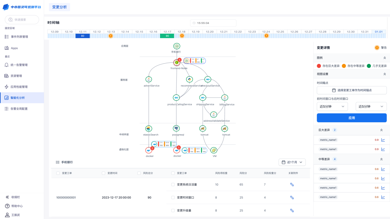 平台支持以应用系统为角度,追踪历史组件变更记录、告警、性能情况,同时以变更工单为输入,分析该次变更的风险分,辅助运维进行变更风险分析,降低风险发生率,并提升故障诊断效率。