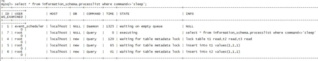 | 4 | root | localhost | new | Query | 392 | Waiting for table metadata lock | lock table t1 read | 0 | 0 |