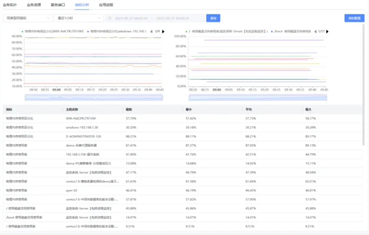 引入业务资源、服务端口、指标分析、应用进程等多项表单及图表功能,便于从多维度对监控资源进行更全面的分析利用;