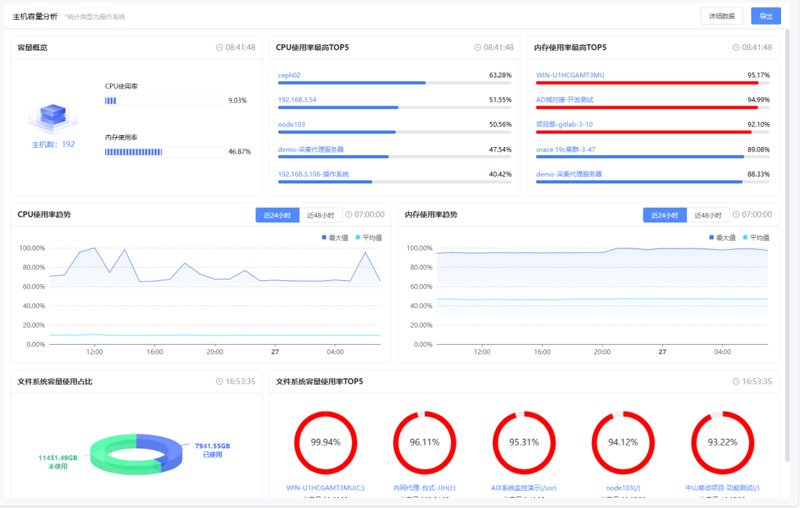 至于业务容量分析,这个功能则进一步提高资源利用率。比如,它能够监测和分析业务主机的关键性能指标,对主机容量、CPU使用率趋势、内存使用率趋势、CPU使用率最高TOP5、内存使用率最高TOP5、文件系统容量使用占比、文件系统容量使用率TOP5等进行监测和分析。这样的监测和分析不仅有助于避免资源不足影响业务运行,还能减少资源浪费,确保资源的投入产出比达到最优。