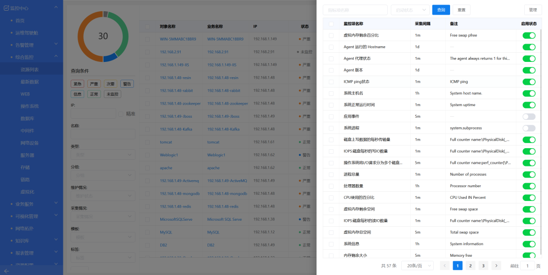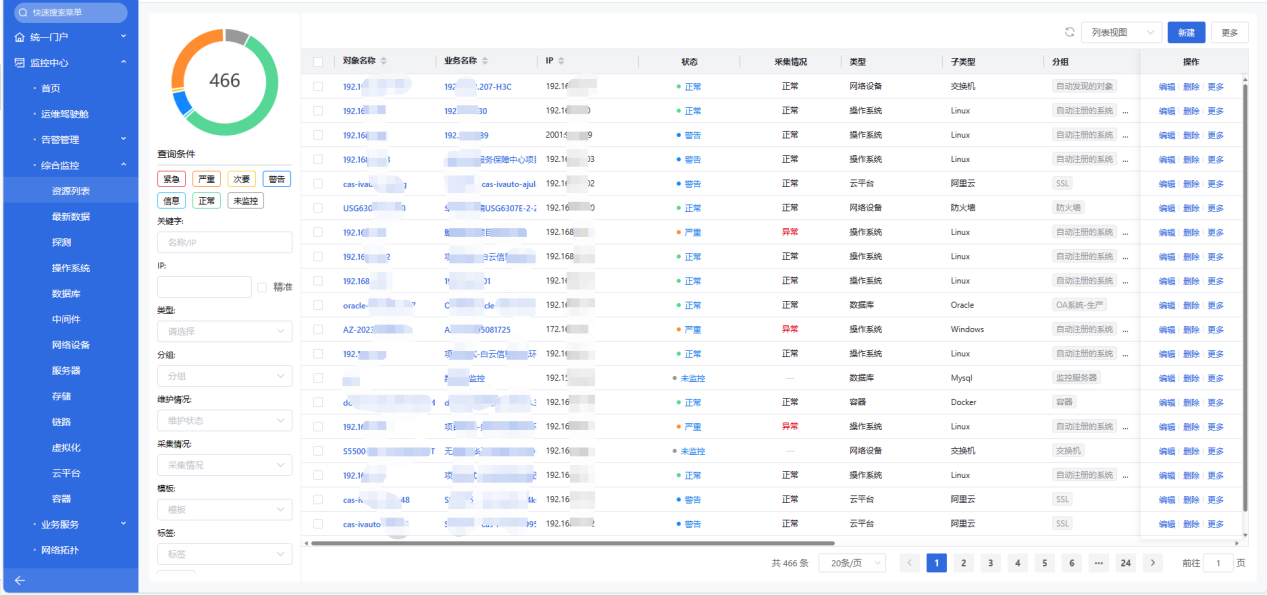 运维控制台:该控制台实时呈现监控系统的整体运行状态,确保监控系统的稳定运行。它详细展示了包括主机、网络设备、数据库、服务器在内的各种资源的告警状态和关键性能指标。