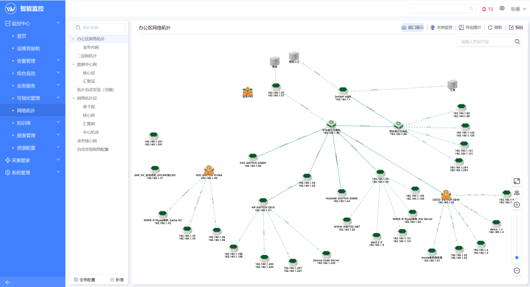 采用全局管理的视角,本平台呈现一种左侧为结构树状图,右侧为网络拓扑图的展示方式。它可以自动计算并绘制出网络拓扑图,并通过不同的颜色表示带宽利用率、趋势图显示网络流量、以及通过告警的闪烁提示来标明每个网络资源的状态异常。这一切共同作用,实现了对网络故障的快速定位,并使运维人员能迅速了解到整个网络的运行状况。