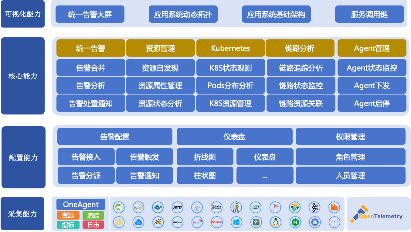 中亦图灵智能可观测平台可支持ResourceTraceMetricLog不同数据类型的采集,链路、指标与应用全景画像已支持100+种,同时内置了100+种告警规则与仪表盘。