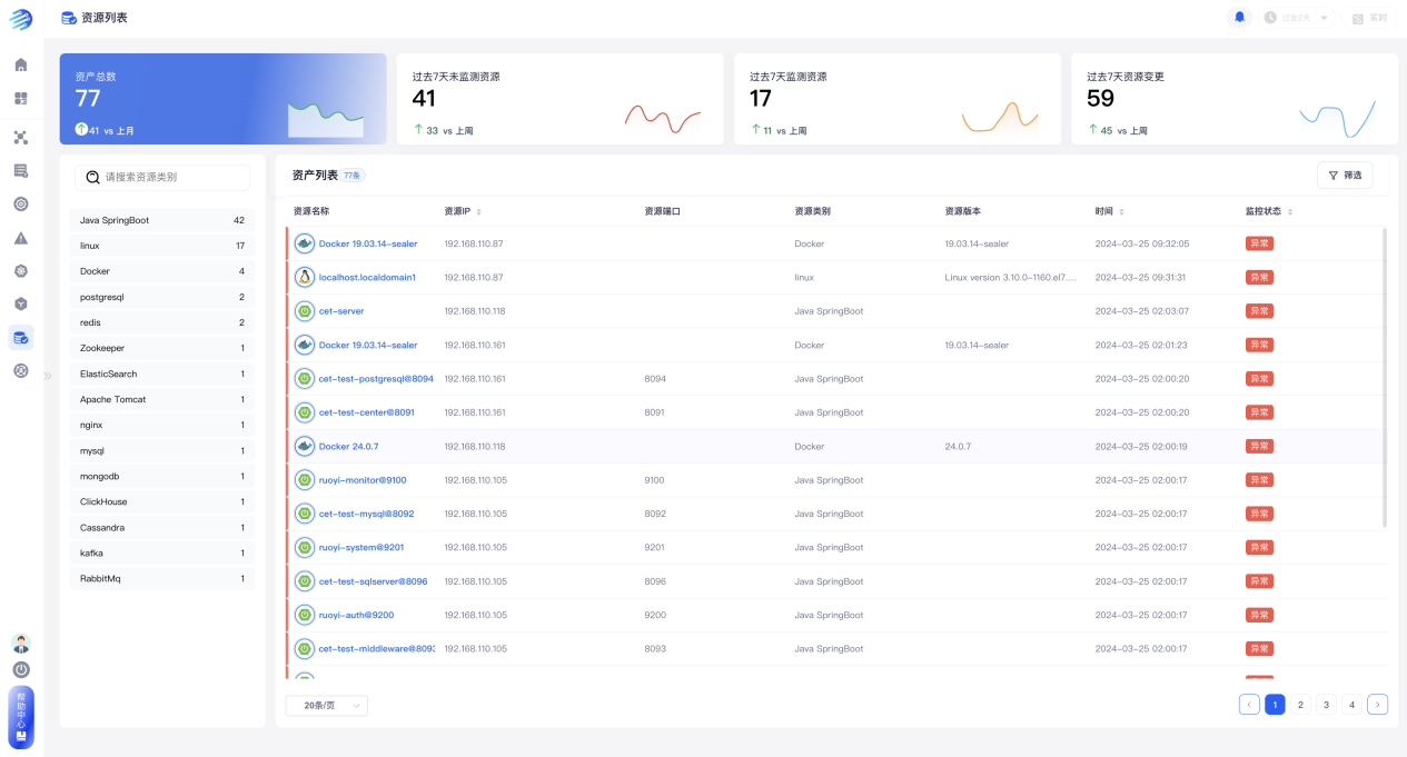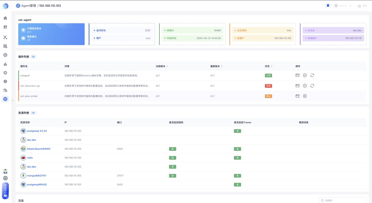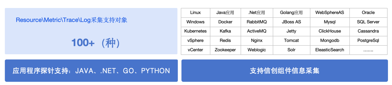 支持200+种常见资源与技术栈的自动发现、指标、链路、日志的采集。其中包括服务器、数据库、K8S、web中间件、消息中间件、java应用框架等。同时支持常见信创资源与技术栈。