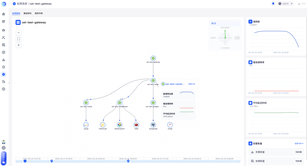 基于资源的自动发现与遥测数据的采集,实现应用架构拓扑的自动化绘制与基于时间线的动态观测,并采用SLO来穿透各资源指标数据与告警,有效缩短MTTR时间,并对变更影响等场景提供数据支撑。