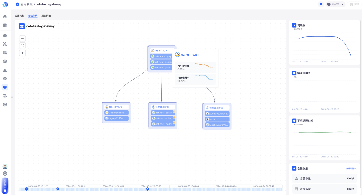 应用系统以卓越的视觉呈现,清晰展示系统与服务间的精妙拓扑关系。它支持服务视角的深入分析,精准展现关键指标与调用链路的内在逻辑。同时还具备基础架构视角,与资源信息联动展示服务器利用率,另外还具备健康与告警视角,可聚焦关键问题与基础设施,帮助用户快速识别潜在的瓶颈和故障点,助力快速定位问题。